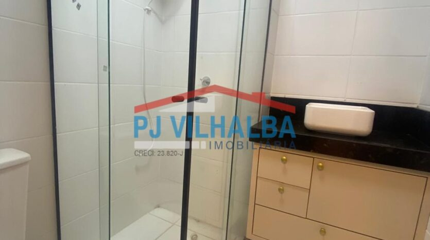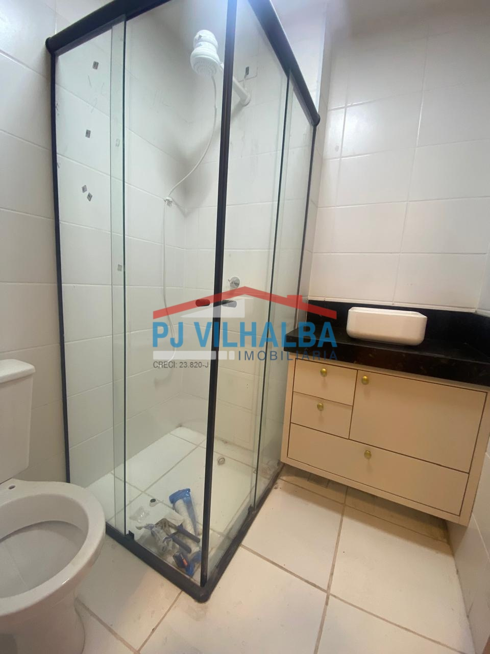 • Banheiro com gabinete, bancada e box